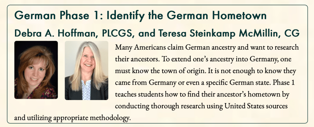 Debra A. Hoffman, PLCGS, and Teresa Steinkamp McMillin, CG, have developed a new German research course that will be offered through the Salt Lake Institute of Genealogy (SLIG) in the fall of 2025. The course is entitled “German Phase 1: Identify the Hometown.” Many Americans claim German ancestry and want to research their ancestors. To extend one’s ancestry into Germany, one must know the town of origin. It is not enough to know they came from Germany or even a specific German state. Phase 1 teaches students how to find their ancestor’s hometown by conducting thorough research using United States sources and utilizing appropriate methodology. For more information on the course and registration, see https://slig.ugagenealogy.org/cpage.php?pt=524.