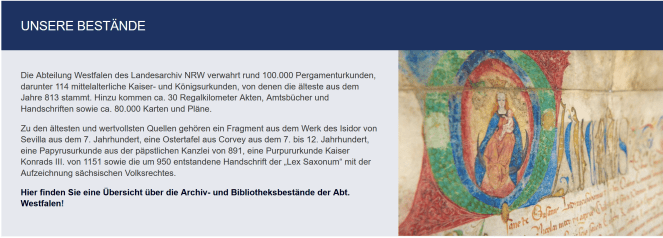 From this main page, scroll down a bit to find the banner “Unsere Bestände.” This means “our archival holdings.” Click the bottom link.
