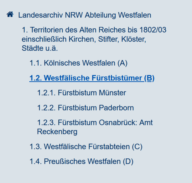 Now the full finding aid appears on the lower left side. It is in a tree structure and there are several levels that we need to explore. Recall that Delbrück in earlier years was under the control of the Fürstbistum Paderborn. For that reason, we want to click on “1.2 – Westfalische Fürstbistümer (B).
