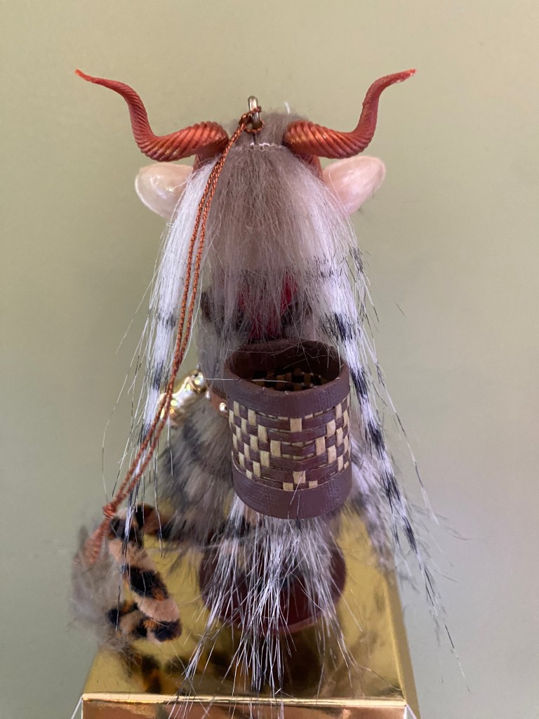 It is probably no coincidence that Krampus is satanic in his looks. As shown with this ornament, he has shaggy hair, horns, and a long red tongue. He carries chains, a bundle of birch branches or rods (Ruten), and a basket for carrying naughty children. As with Marley in A Christmas Carol, Krampus will rattle his chains to incite fear. The birch rods are used to swat bad children, and the basket was the means for carrying bad children away.