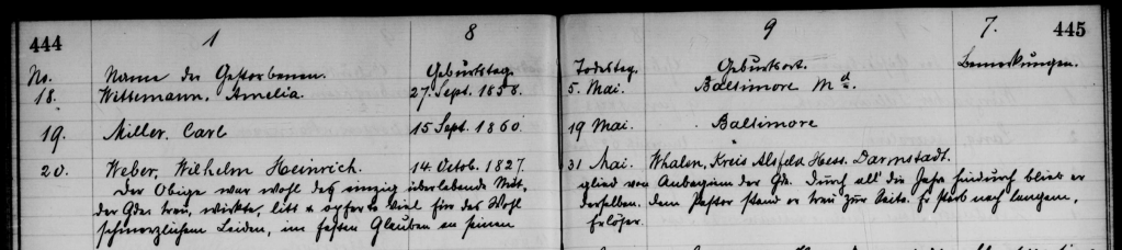 [2] St. Stephen’s Evangelical Lutheran Church Collection (Baltimore City, Maryland), Book 1, pp. 444–5, deaths, 1897, no. 20, Wilhelm Heinrich Weber, 31 May 1897; digital images, Maryland State Archives (https://msa.maryland.gov : accessed 2025), Special Collection 4216-1, microfilm SCM 1477; Maryland State Archives, Annapolis.