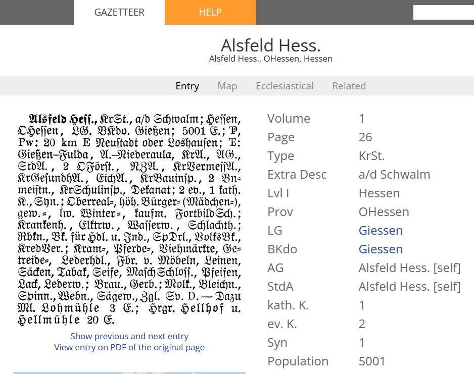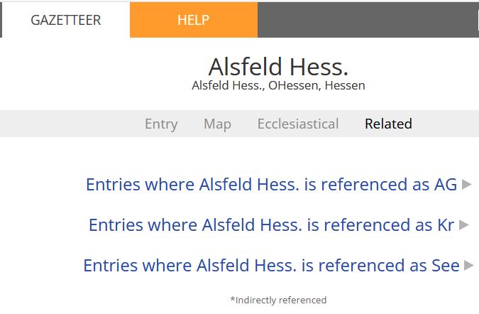 In that entry, we see that Alsfeld is a Kreis Stadt, which means it’s a larger city and the seat of the district Alsfeld. It’s kind of like Chicago is the seat for Cook County. In the light gray bar across the top of this entry, you’ll see the word “Related.” This will show me places related to Alsfeld. Click on that.