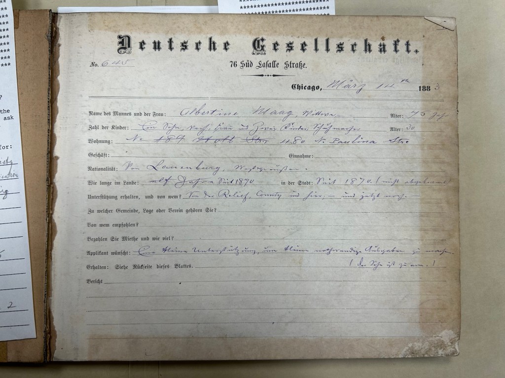 At the University of Illinois – Chicago (UIC), there is a manuscript collection for the “German Aid Society, 1878–1977.” Its comprehensive finding aid may be found here: https://explore.chicagocollections.org/ead/uic/25/ms3t/ .