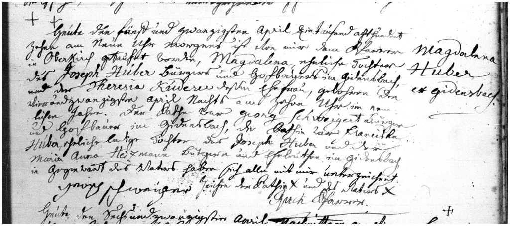 [2] Katholische Kirche (Oberkirch, Offenburg, Baden), Taufen [Baptisms], 1778–1840, p. 359, Magdalena Huber; FamilySearch, FSL 995,507.