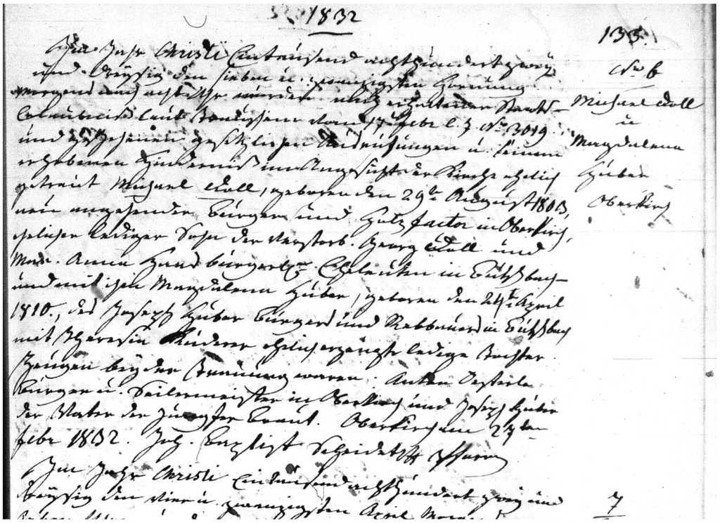 Fortunately, this was a detailed record, It told me that Magdalena was born 24 April 1810, the daughter of Joseph Huber and his wife, Theresa Kuder. Her parents lived in Butschbach at the time of the marriage. Unless Magdalena and Lawrence were half-siblings, these are also Lawrence’s parents.