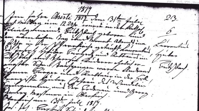 Lawrence’s baptism also contained specific information about his birth. He was born 31 July 1817 at 12:00 noon in Butschbach. Sometimes people are born in a small village near where the church was located, so this record clarified that information. He was baptized the same day at 4 p.m. in the parish church. Isn’t it amazing to think he was baptized just four hours after his birth? It also tells us he was a healthy baby. Sometimes a midwife might administer an emergency baptism, not the case with Lawrence.