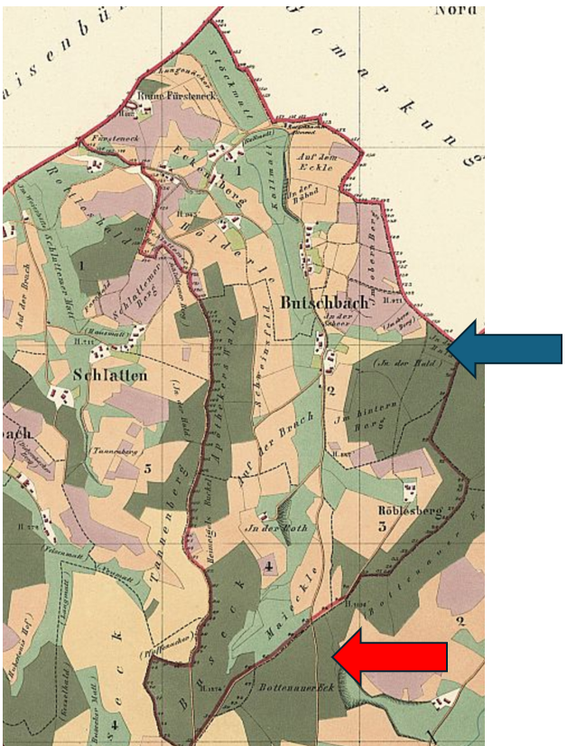The blue arrow shows “in der Huld,” and the red arrow shows “Bottenauer Eck.” This beautiful map is easier to see online: http://www.landesarchiv-bw.de/plink/?f=4-468200.