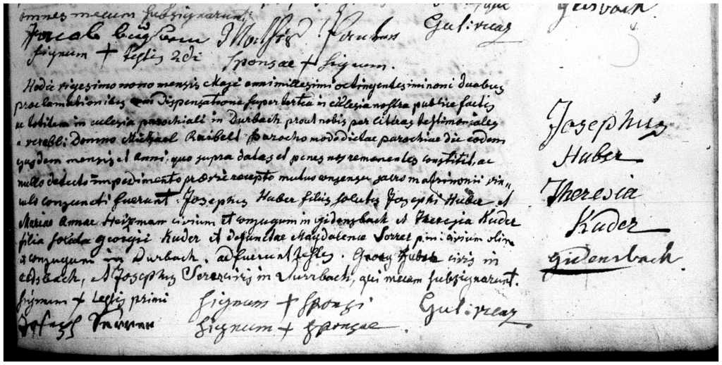 Lawrence’s parents, Joseph Huber and Theresa Kuder, married in 1809, as mentioned in the prior post. Their marriage record, written in Latin, gives more information about them. Joseph Huber’s parents were Joseph Huber and Maria Anna Heizmann who lived in Giedensbach. Theresa’s parents were Georg Kuder and Magdalena Sorrer who lived in Durbach. Magdalena was deceased. Durbach was a nearby village with its own parish, so Theresa’s baptism might be found there. The people who witnessed their marriage were Georg Huber and Joseph Sorrer, surely relatives. The groom, bride, and witnesses signed the record. Joseph and Theresa signed with their marks, so we know they cannot write.[4]