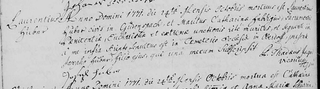 I found a potential baptism record for Laurenz in 1715. In fact, it was the only child named Laurenz that I found with a father named Johann.[2] This would have made him thirty-five years old when he married Catharina in 1750. Careful reading of that record tells me it was his first marriage. It’s certainly not out of the question, but it is on the older side for a first marriage. I needed further confirmation. I really wanted to find his death record. Sometimes you must work forwards before you can go backwards. Death records might give an age for a person, helping to approximate a birth date.