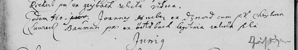 [2] Katholische Kirche (Oberkirch, Offenburg, Baden), Heiraten [Marriages], 1647–1815, 19 May 1696, Hueber-Bauman; FamilySearch, FSL 995,509.