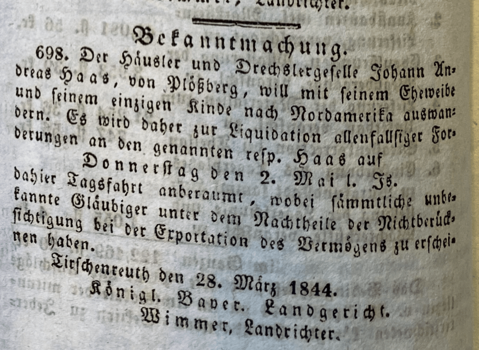 From German Girls Genealogy (Teresa Steinkamp McMillin and Debra A. Hoffman): At a recent trip to the Staatsarchiv [State Archive] Amberg located in Amberg, Bavaria, we were excited to find entire newspaper issues contained in the Auswanderakten (Permissions to Emigrate). The following translated excerpt is from Nr. 30 of the Allgemeiner Anzeiger für das Königreich… Continue reading Bavarian Emigration File